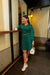 Su delicado escote en V estiliza el cuello con gracia, mientras que las mangas largas abullonadas añaden un aire sofisticado y contemporáneo. La cintura definida enmarca la silueta con armonía, y la falda evasé despliega un movimiento fluido que realza la feminidad con elegancia.