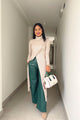 Cuenta con un detalle en tela satinada en la pretina, que le añade un toque único y sofisticado. La prenda incluye bolsillos para mayor funcionalidad, un cierre, un broche de gancho metálico, unas pinzas en la espalda para formar mejor el derrier y elástico en la pretina para mayor comodidad.